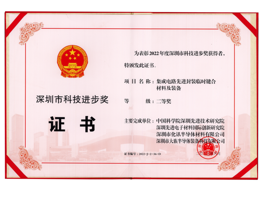 2023年6月,由深圳市不朽情缘半导体装备科技有限公司、中国科学院深圳先进技术研究院、深圳先进电子材料国际创新研究院、深圳市化讯半导体材料有限公司共同申报的“集成电路先进封装临时键合材料及装备”项目,荣获2022年度“深圳市科技进步奖”二等奖。