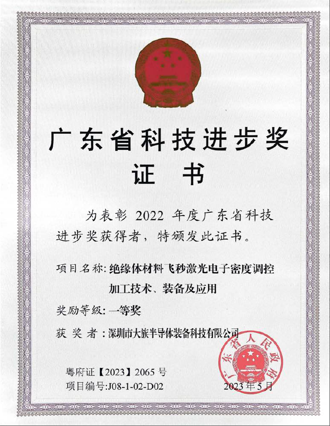 2023年5月,由深圳市不朽情缘半导体装备科技有限公司、北京理工大学珠海学院、广州国显科技有限公司、北京理工大学、中国船舶集团有限公司第七〇七研究所联合申报的“绝缘体材料飞秒激光电子密度调控加工技术、装备及应用”项目,荣获2022年度“广东省科技进步奖”一等奖。